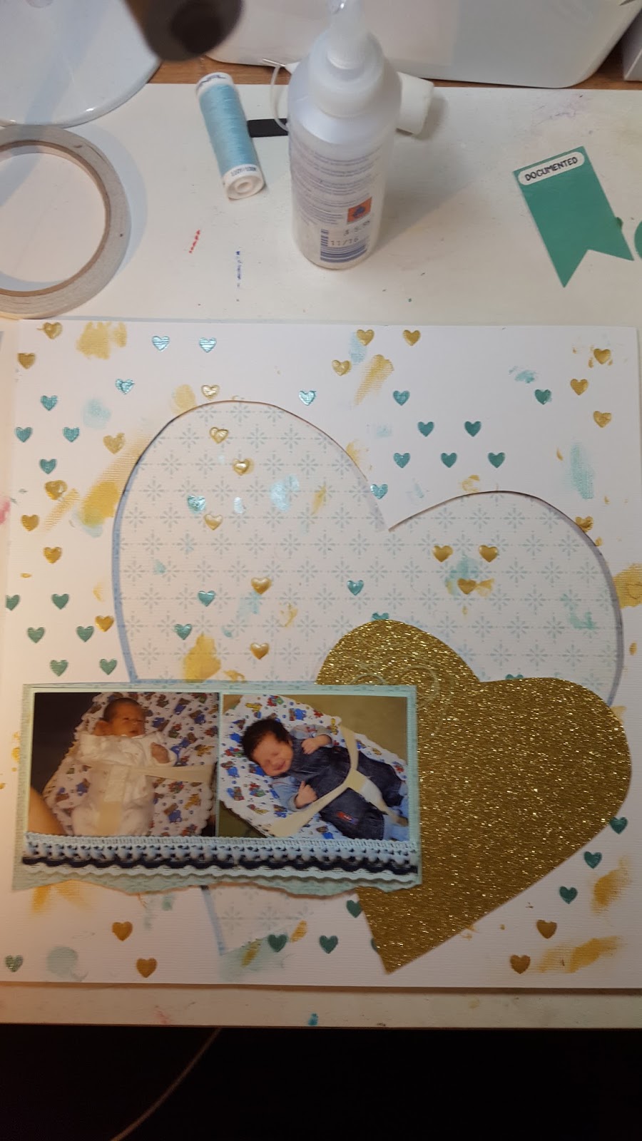 Here is the placement of the words, I also added some light blue cotton/thread to give another texture. Only small amount of embellishments were needed for the layout, tab on the top of photos and two tags of either side with "gold" tiny alphas to spell out boys name (so can ensure we always know which child was which - even though they very different hehe). The puffy thicker sheets even had the perfect puffy tiny hearts that I scattered around the layout for added texture.